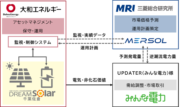 大和エネルギー株式會社(代表取締役社長:東 武、以下 大和エネルギー)と株式會社三菱総合研究所(代表取締役社長:籔田 健二、以下 MRI)は、大和エネルギーが保有する太陽光発電所「DREAM Solar 千葉佐倉」(千葉県佐倉市)に新設した蓄電池に、MRIの分散型エネルギーリソース運用計畫策定サービスを連攜し、4月1日から正式に共同運用を開始しました。