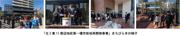 本再開発事業(yè)は、約15,000㎡の敷地に、住宅?商業(yè)施設?醫(yī)療施設で構成されたA街區(qū)?B街區(qū)、既存機能更新エリアとして寺院施設を集めたC街區(qū)、業(yè)務施設を建設したD街區(qū)の4つに區(qū)分され、多世代が「にぎわい」と「交流」を創(chuàng)出するまちづくりを目指しました。 このたび開催した「まちびらき」では、北3東11周辺地區(qū)市街地再開発組合の事務局長 山重が開會宣言し、関係者による鏡開きを行った後、各施設を見學しました。また、B街區(qū)商業(yè)エリアテナントのコンビニエンスストアによるスイーツやドリンク配布も行われました。