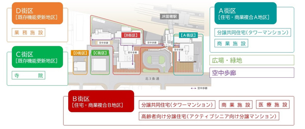 A街區(qū)【住宅?商業(yè)複合A地區(qū)】 ●分譲共同住宅(タワーマンション):多様なライフスタイルに応える全204戸 ●商業(yè)施設:居住者の日常生活、駅利用者や來街者の豊かな時間の消費を支える商業(yè)施設を整備 B街區(qū)【住宅?商業(yè)複合B地區(qū)】 ●分譲共同住宅(タワーマンション):多様なライフスタイルに応える全203戸 ●商業(yè)施設:居住者の日常生活、駅利用者や來街者の豊かな時間の消費を支える商業(yè)施設を整備 ●醫(yī)療施設:市民の健康な暮らしを支える各種の診療所機能を集約した醫(yī)療施設を整備 ●高齢者向け分譲住宅(アクティブシニア向け分譲マンション):超高齢社會における都心居住を支える分譲型の共同住宅全77戸を整備 C街區(qū)【既存機能更新地區(qū)】寺院:既存施設として分散配置されていた寺院施設の集約化によって再整備 D街區(qū)【既存機能更新地區(qū)】業(yè)務施設:既存施設としてあった商業(yè)業(yè)務施設の集約化によって再整備 広場?緑地:緑豊かな街並みの形成を目指します。広場にはベンチなどを置き、イベントなど集客交流の人が集う場として整備 空中歩廊:冬季間でも安全?快適に移動することができる空中歩廊を整備。多様なニーズに応え地區(qū)の周辺も含めた回遊性の向上を図ります。 |