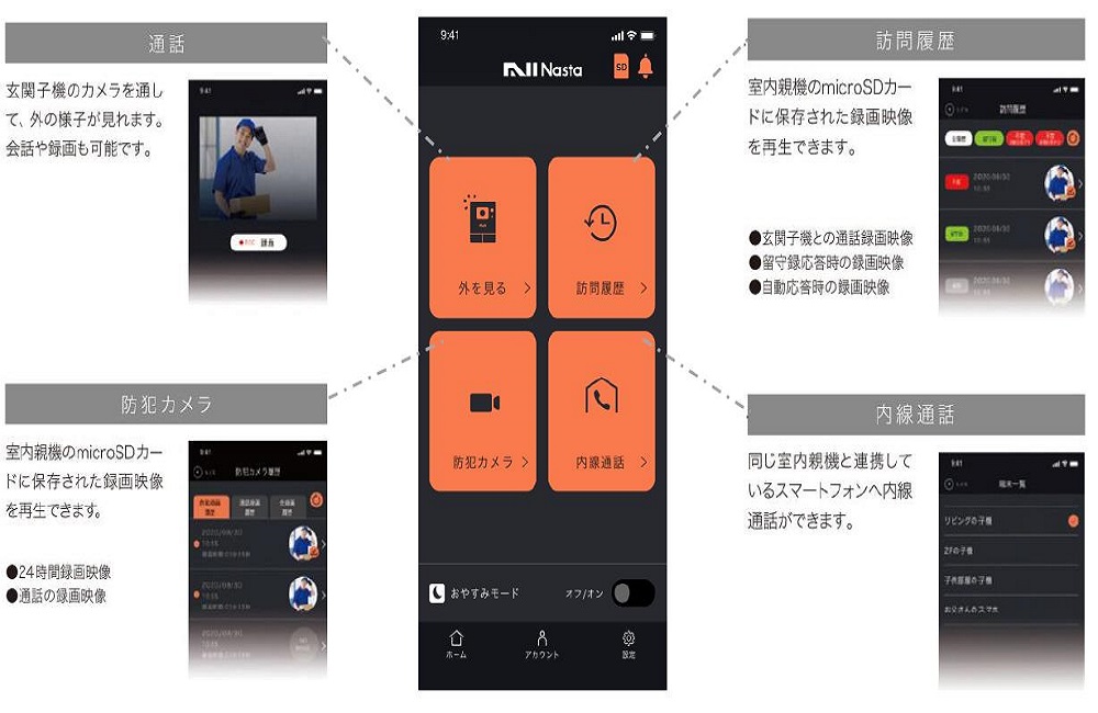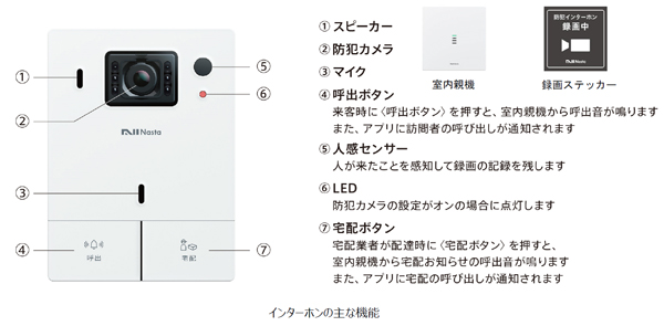 ●「Next-Dbox+S」の商品特長 1、「Nasta Interphone」 「Nasta Interphone」は、24時間監視カメラ機能を搭載したことで、常に玄関先の撮影?録畫を可能としたとともに、宅配専用ボタンを押すと流れる自動応答メッセージにより、宅配業者と會話することなく荷物を受け取ることができます。また、スマートフォンやタブレットの専用アプリをダウンロードすることで、どこでも(※4)アプリを通じて來訪者の確認や応答ができます。 ※4. 外出先で応答?確認する場合は、オプションプランの申し込みおよび月額料金と通信費が発生。