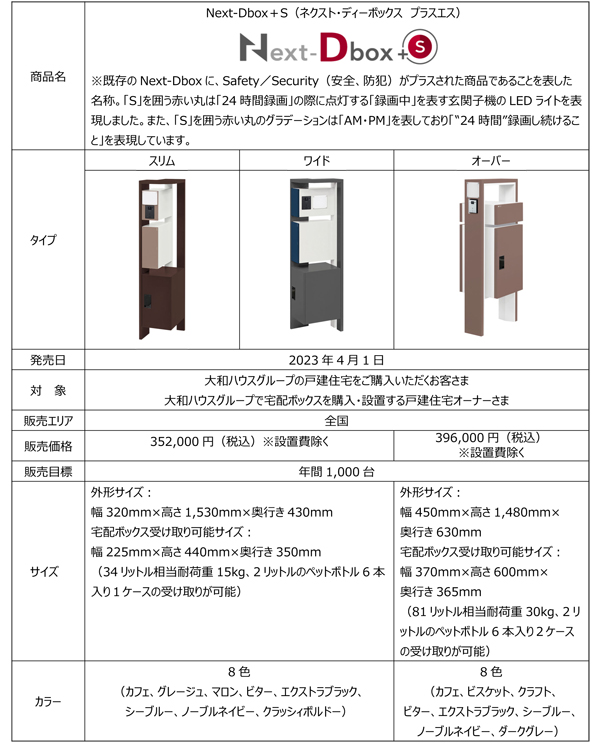 新型コロナウイルス感染癥拡大などの影響でeコマースの利用が増加したことにより、2021年度の宅配便取扱個數は、49億5,323萬個(※1)と過去最高になるなど、10年前と比較すると約1.4倍に増加しています。 宅配ボックスは、テレワークなどにより在宅時間が増加する中においても、非対面?非接觸で荷物を受け取ることができることに加え、近年広く普及した「置き配」サービスによる荷物の盜難や破損の心配がない商品としてさらに需要が高まっています。 そのような中、両社が新たに開発した「Next-Dbox+S」は、2020年1月に共同開発したスマートキーを搭載した戸建住宅向け宅配ボックス「Next-Dbox」(※2)に、「24時間防犯カメラ」と自動応答設定が可能な「宅配専用ボタン」付きの「Nasta Interphone(ナスタ インターホン)」(※3)を搭載。宅配ボックスとインターホンを一體化させたことで、セキュリティと利便性を向上させた新しい宅配ボックスです。 ※1. 國土交通省「令和3年度 宅配便取扱実績について」より。(2022年8月10日公表) ※2. 商品Webサイト:http://m.upijeej.cn/jutaku/lifestyle/box/ ※3. ナスタが開発した2022年度グッドデザイン賞とキッズデザイン賞受賞商品。 商品Webサイト:https://www.nasta.co.jp/product/electrical/interphone-home/ |