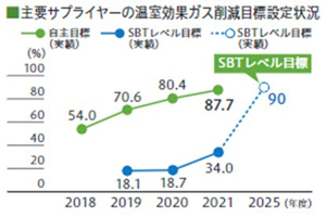 ■サプライヤーとの協働について 當社では、溫室効果ガスの排出量削減に向けて、サプライヤーによる削減目標の設定を推進しており、2025年度までに主要サプライヤーの90%以上が「SBT」水準の目標を設定することを目指しています。 そのため、當社では2019年度より毎年、主要サプライヤー全203社(※3)に対してアンケート調査を実施し、溫室効果ガス排出量の削減目標や実績、削減施策の実施狀況を確認しています。2021年度のアンケート調査では、サプライヤーの溫室効果ガス削減目標設定率は87.7%、「SBT」水準の目標設定率は34.0%となりました。 |