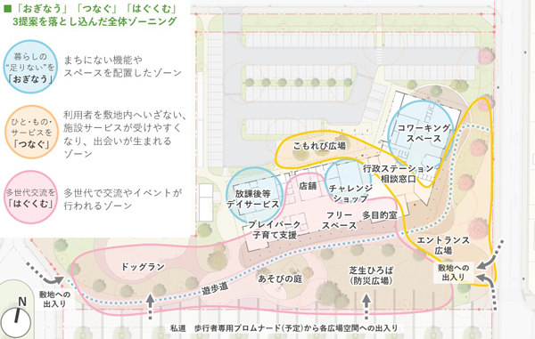 「(仮稱)三木地域交流拠點」は、「共におぎなう?つなぐ?はぐくむ」というコンセプトでの取り組みをテーマに、子どもから高齢者まで多世代が集い、交流を生む拠點です。新たなコミュニティの形成や地域活動の推進によって、市內の住宅団地活性化のモデルを創出することも目的としています。本事業では、テーマに沿って拠點整備やサービス提供を行い、地域住民の利便性向上や多世代交流を促進します。 |