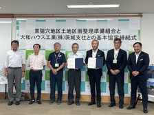 大和ハウス工業 茨城支社は、茨城県牛久市の「(仮稱)東猯穴(ひがしまみあな)地區土地區畫整理事業」の事業協力者に選定されました。8月8日、牛久市役所にて牛久市根本市長(寫真左から3人目)立會いのもと、東猯穴地區土地區畫整理事業準備組合(池田晃一理事長:寫真中央)との基本協定締結式が行われ、茨城支社長や住宅事業部長らが出席しました。