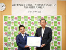 大和ハウスグループの大和物流株式會社(本社:大阪市西區、社長:杉山 克博)は、2024年9月2日に大阪市西淀川區と地域防災を中心として、物流支援や市民生活の安全?安心に関する包括連攜協定(以下「本協定」)を締結し、同日に締結式を執り行いました。
