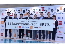 <開催レポート> 夏休みを前に、大手フィットネスクラブ7社が集結し、競泳金メダリスト萩野公介氏とともに水難事故から子どもの命を守る「著衣水泳」體験の重要性を呼びかけ