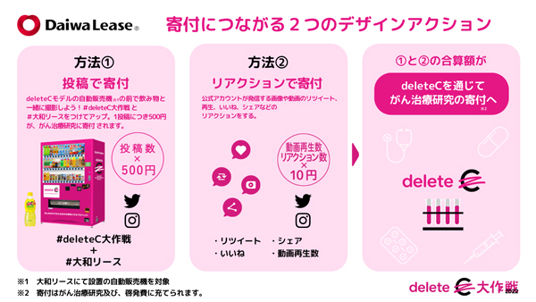 「#deleteC大作戦」は、「あつまれ、想い」をスローガンに掲げています。期間中に當社が管理運営する公園や複合商業施設に設置の「deleteCモデル自動販売機」とその自販機で購入した商品を一緒に撮影し、その畫像に「#deleteC大作戦」と「#大和リース」をつけてSNSで投稿、もしくは當社公式Twitter?Instagramアカウント、下記施設の公式Instagramアカウントの該當投稿に対してリアクション(いいね)すると、SNSでの1投稿が500円、1リアクション10円ががん治療研究への寄付?啓発費用として、當社からdeleteCを通じて屆けられます。