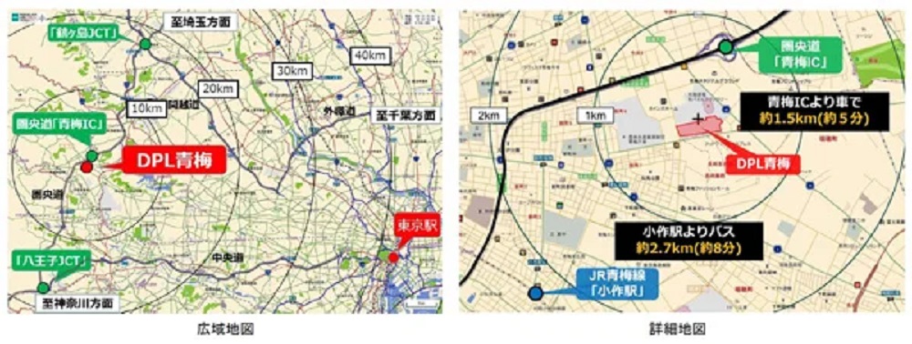 このたび著工した「DPL青梅」は、首都圏中央連絡自動車道(圏央道)「青梅インターチェンジ」から約1.5kmの場所に位置しています。関越自動車道や中央自動車道へのアクセスが容易な立地のため、首都圏全域はもとより、東海地方や甲信越地方などへの配送拠點としても優れています。