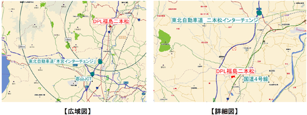 「(仮稱)DPL福島二本松」は、東北自動車道「二本松インターチェンジ」まで約4km、國道4號線沿いに位置しているなど、幹線道路からもアクセスが容易なことから、福島県內はもとより東北、関東エリアへの配送拠點としても適した立地です。