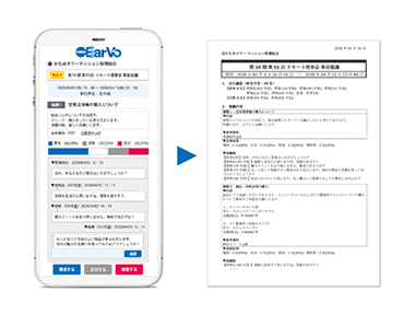 「リモ?アーボ」は、オンライン事前協議と対面會合の両方を開催するにあたり、主催者の負擔を徹底的に減らす様々な機能を実裝しています。オンライン事前協議の開催通知は、メールで參加者にリンク招待され、議題は入力欄に沿って入力していくだけで簡単に作成でき、添付資料のアップロードや投票形式の設定も可能です。チャット形式での質疑応答ができ、參加者全員がいつでも議論の流れを確認できます。現在の投票結果はグラフ表示されるので、リモートでは分かりづらい場の雰囲気を參考にでき、期間中は何度でも意思表明の変更ができます。事前協議期間終了後は、質疑応答內容や投票結果を自動でPDF化し、主催者へメールで屆きます。拡張機能版では、Wordでの出力も可能のため、対面會合の前後で追記することも可能です。
