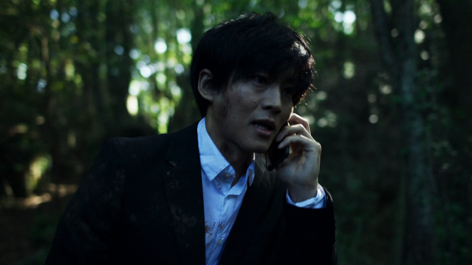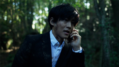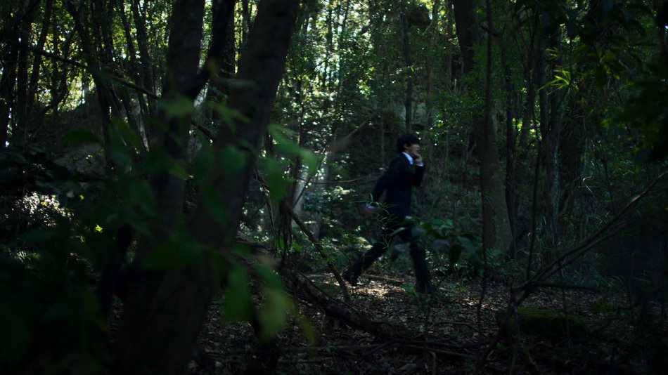 険しくも、木漏れ日が差す美しい樹海のロケーションに、黒いスーツで決めた松坂さんが入ると、まるで映畫のワンシーンのような空気感になりました。