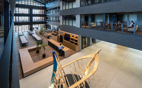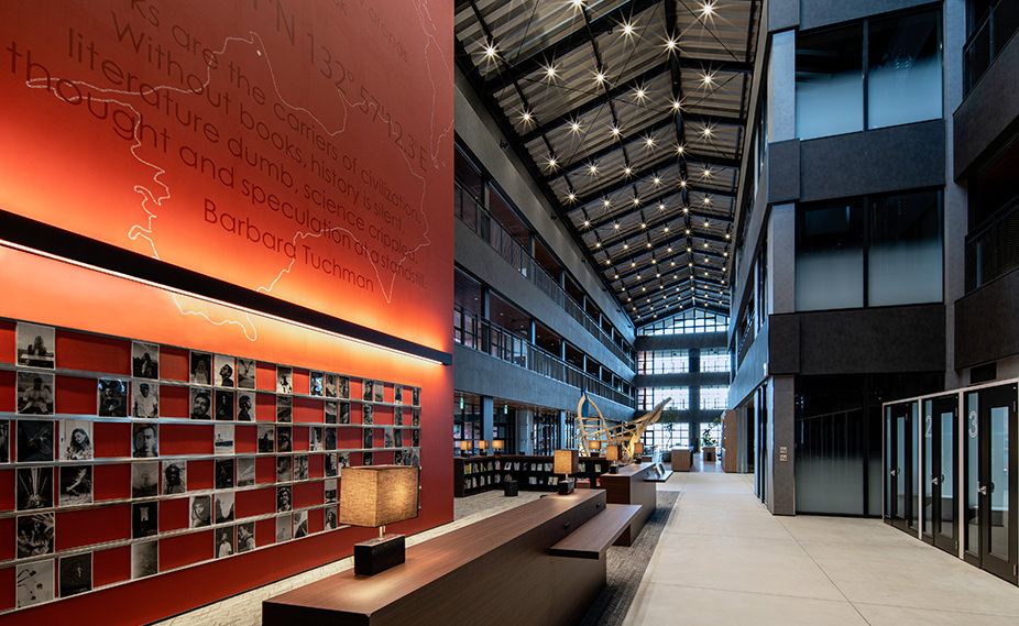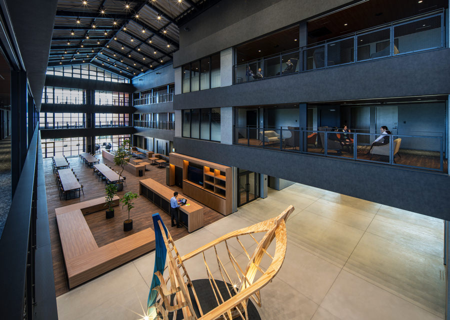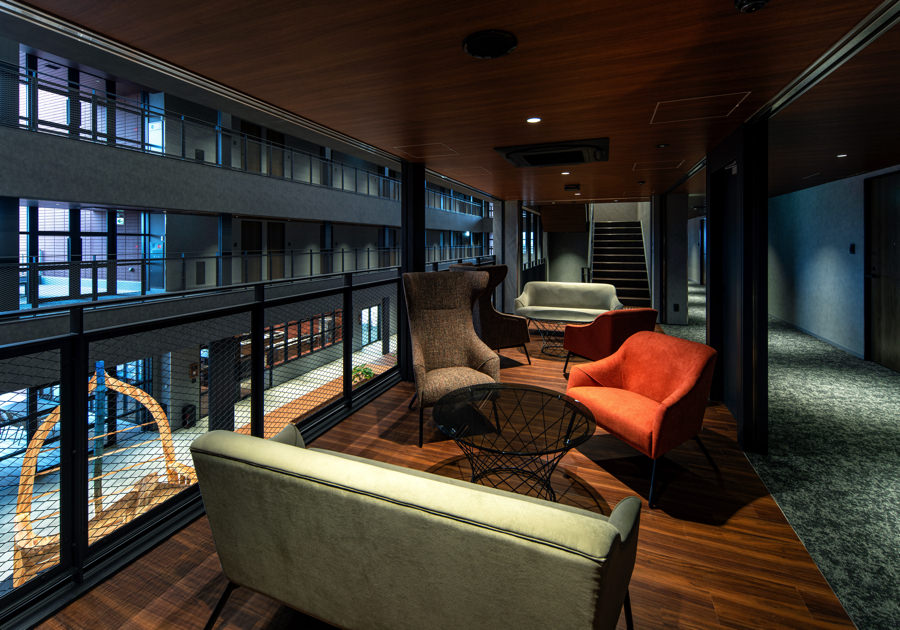 多様なコミュニケーションやコラボレーションの誘発を意図して、中央の大きな吹抜空間を取り囲むように寮室と、ラウンジ?共同キッチン?ライブラリー?トレーニングジム?テラス等の共用部を配置した建物構成です。