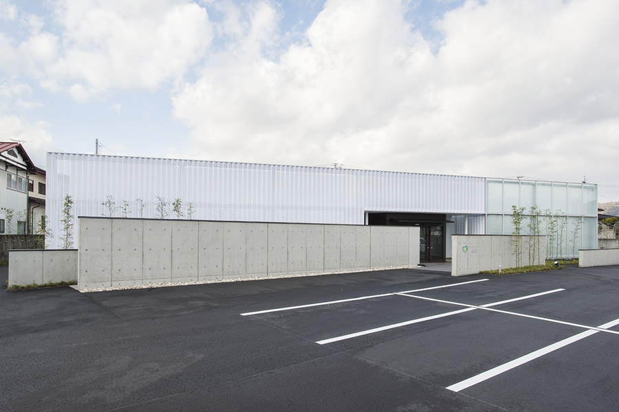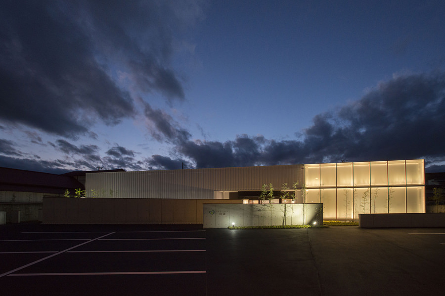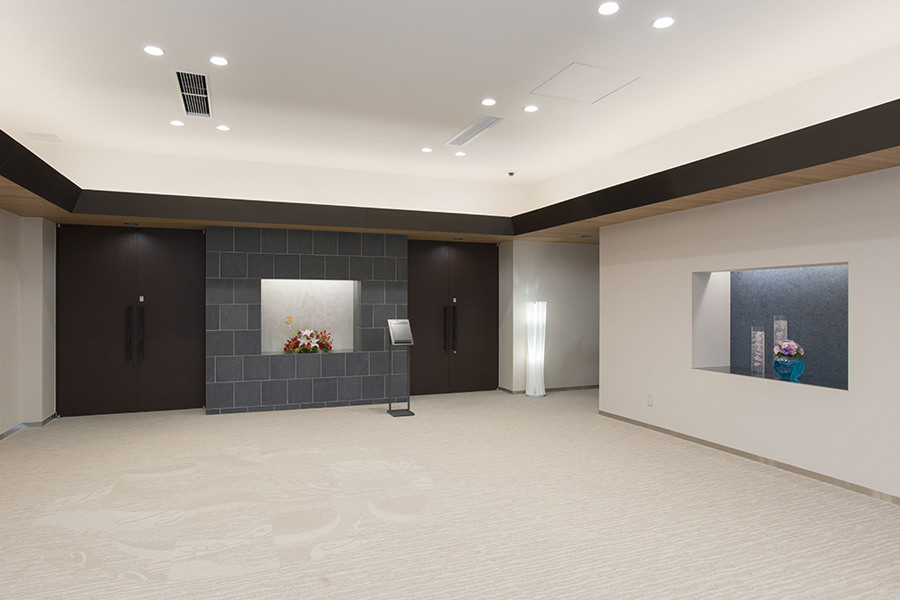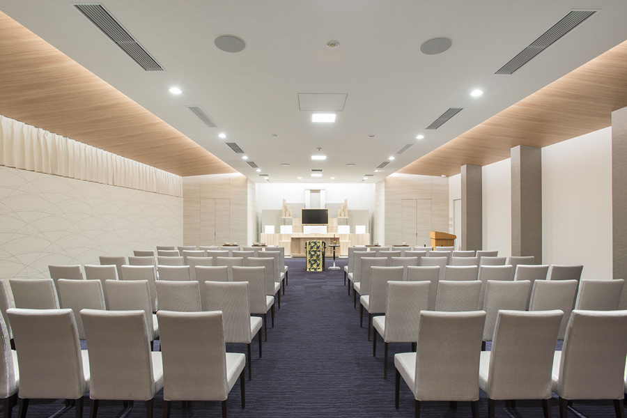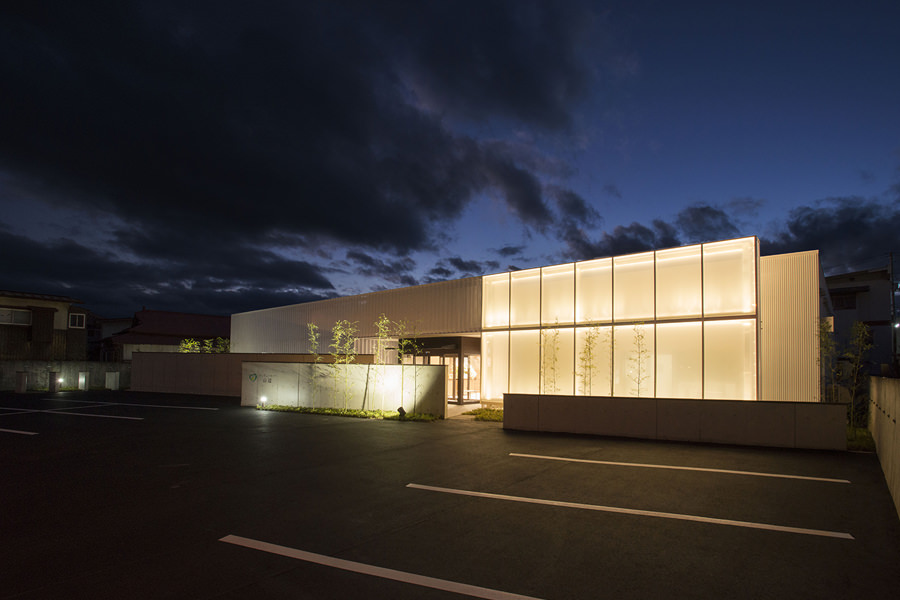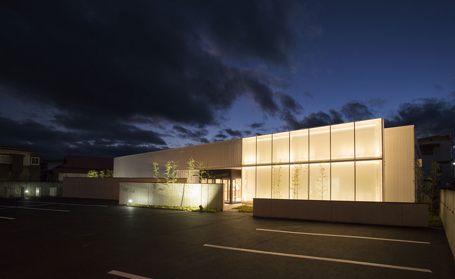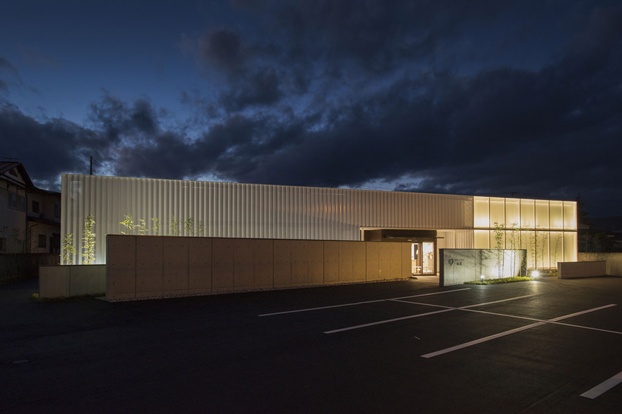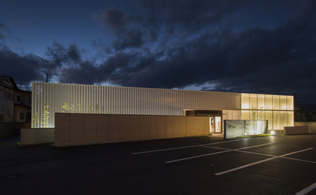 既存のレンタルショップを葬儀場へとリノベーション。既存建屋の前に、建物と前面道路の二軸に平行な壁を挿入することで、俗世である外部から神域としての內部空間に結界を張りながら、祈りの空間へと參列者を誘うアプローチを創出。內部は、既存建物の低い階高の制約を受けながら、低い連続した軒先と光の効果により、空間に広がりを持たせた。