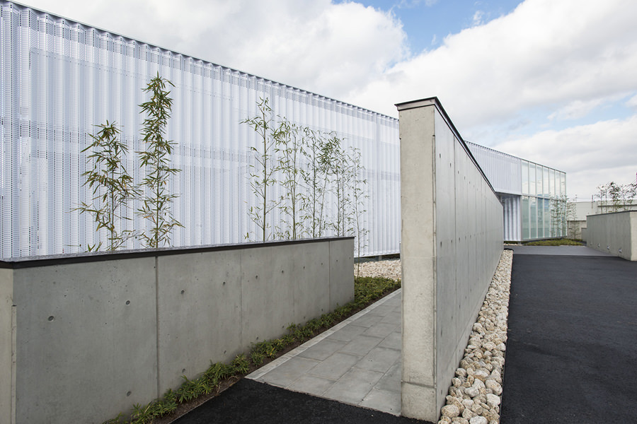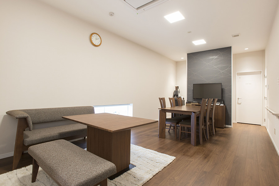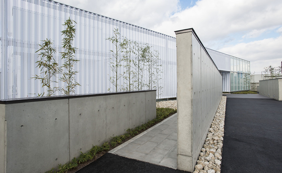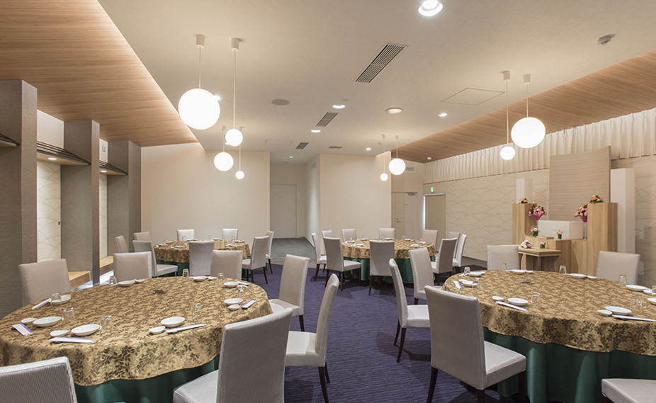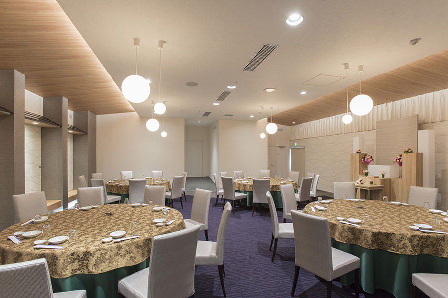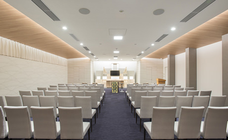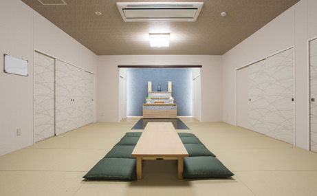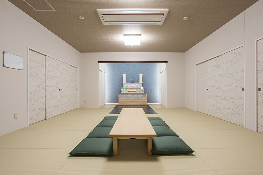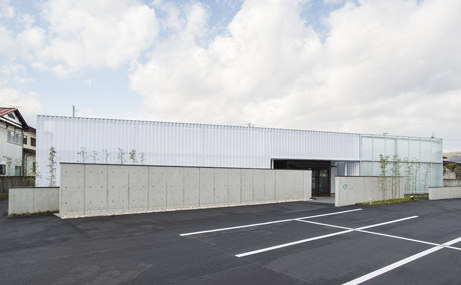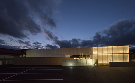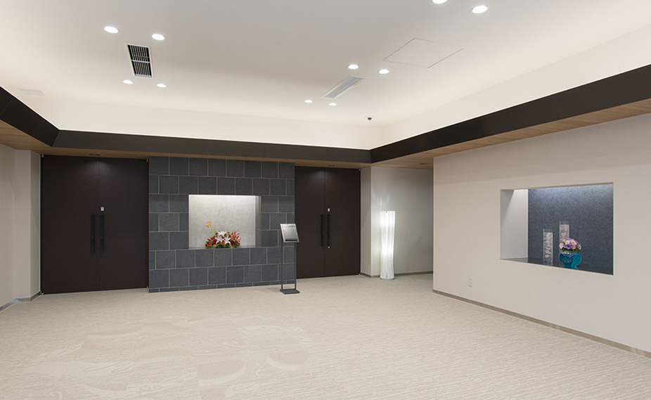 既存のレンタルショップを葬儀場へとリノベーション。既存建屋の前に、建物と前面道路の二軸に平行な壁を挿入することで、俗世である外部から神域としての內部空間に結界を張りながら、祈りの空間へと參列者を誘うアプローチを創出。內部は、既存建物の低い階高の制約を受けながら、低い連続した軒先と光の効果により、空間に広がりを持たせた。