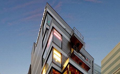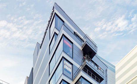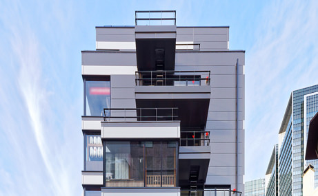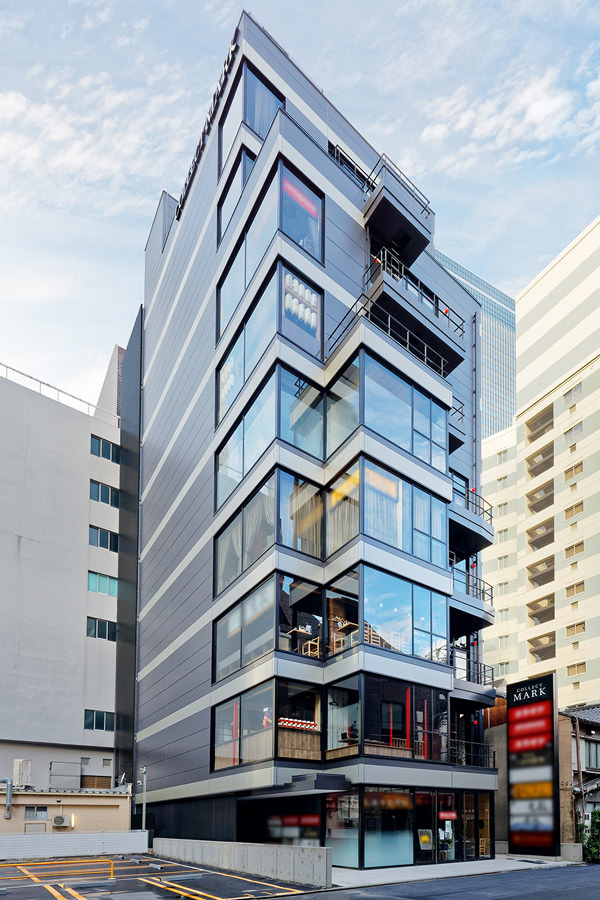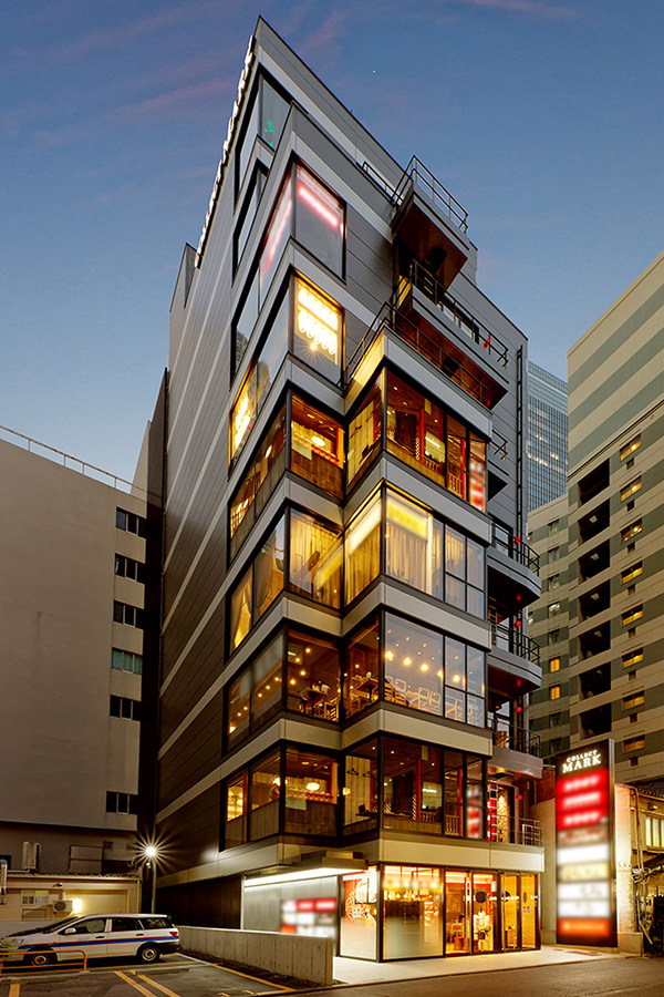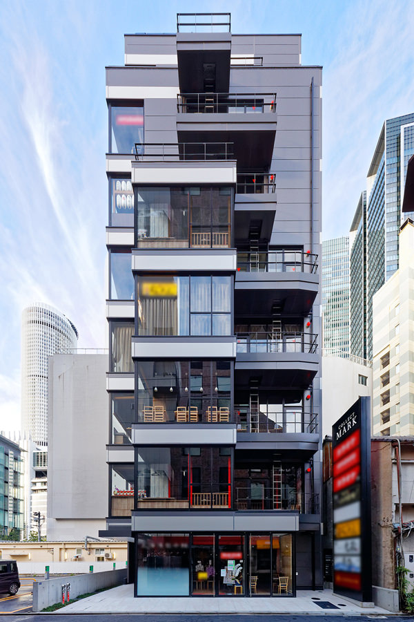 名古屋駅徒歩1分の好立地な敷地に建つ9階建てのテナントビル。敷地の容積率を最大限活かして上階ほどセットバックする建物形狀とし、各階の店舗の顔がみえるようガラスの箱を積み上げた外観としている。エレベーターを敷地の奧に配置し、光天井のエントランスアプローチによりやさしい光で迎え入れるかたちとしている。