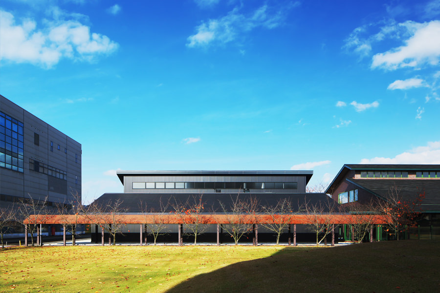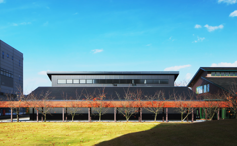 工場敷地內での研究棟新築工事。既存食堂棟と近接する為、建物の連続性を意識した建物形狀とした。コストをかけない中で素材選定や開口部の調整を行い、既存樹木、芝生広場との関係性を意識して設計した。