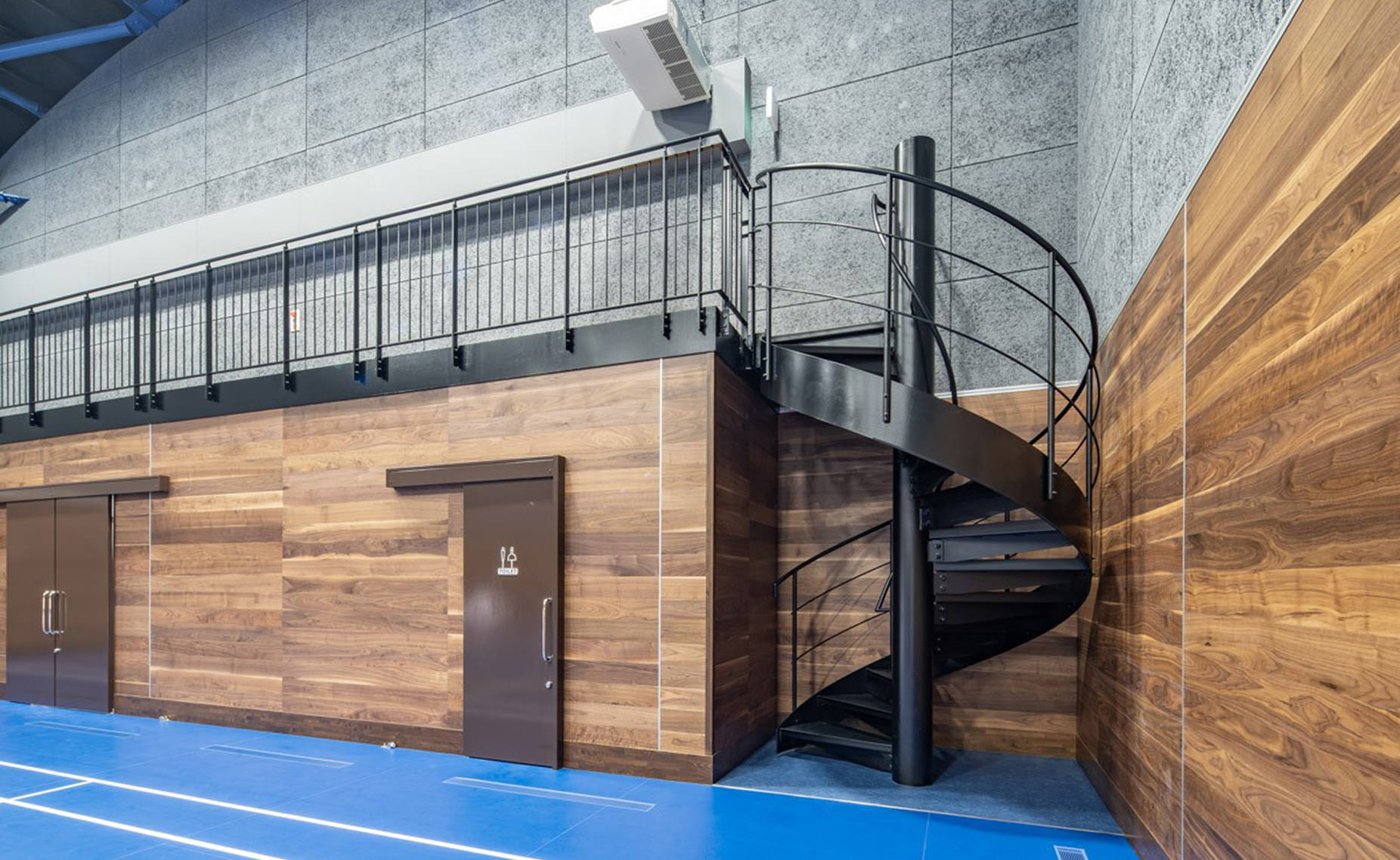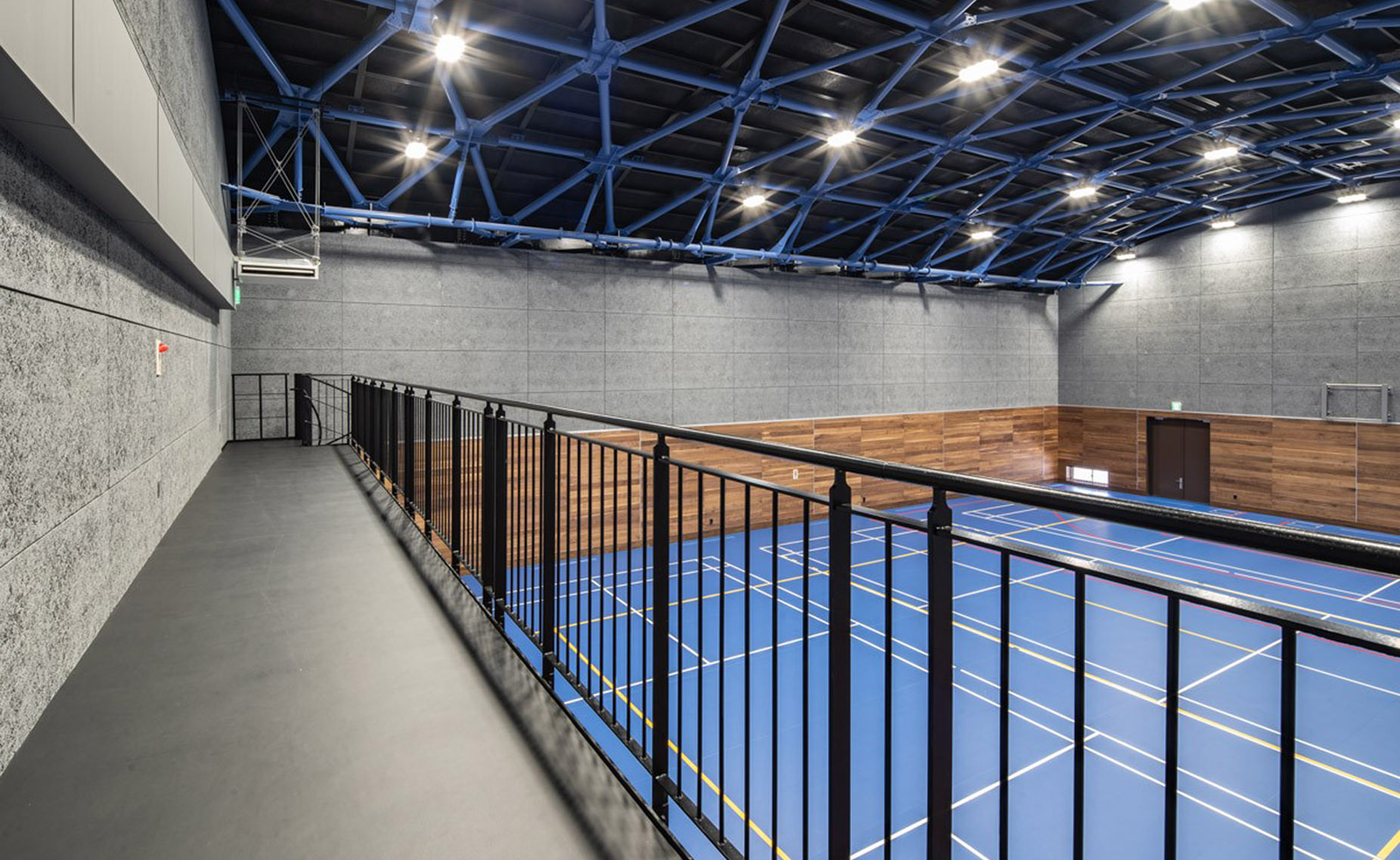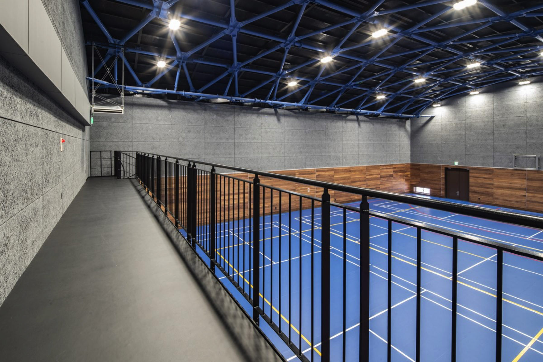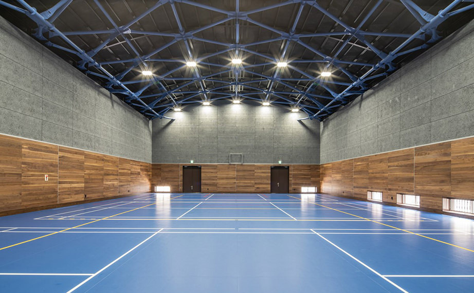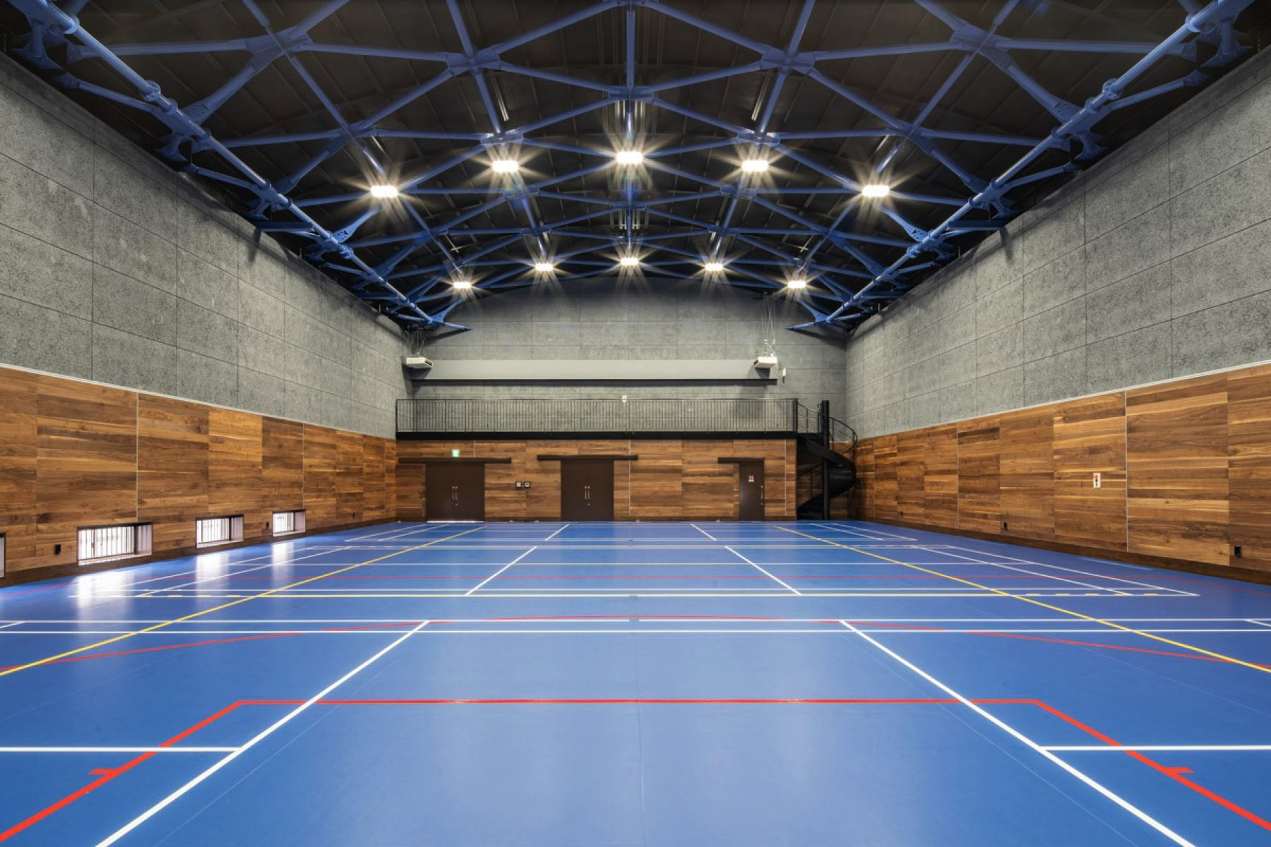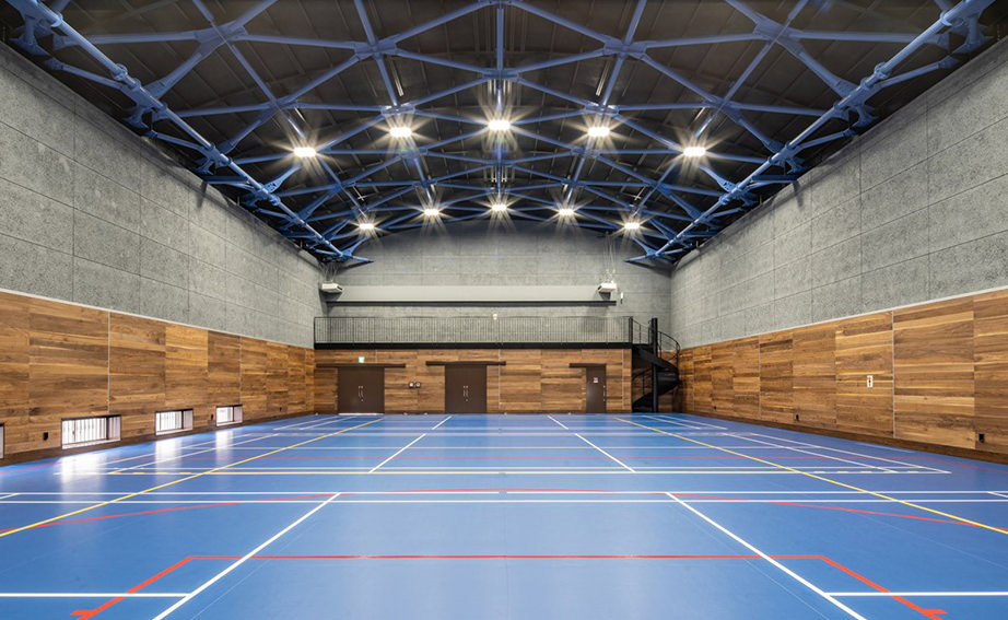 內裝について木材を取り入れ、油山の自然を感じるデザインとしただけでなく、色はバドミントンシャトルが周囲と同化しない色にすると同時に、體育館內が暗い印象とならない様に、選手と確認をしながら色の調整をしました。