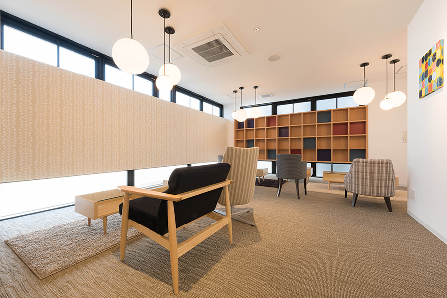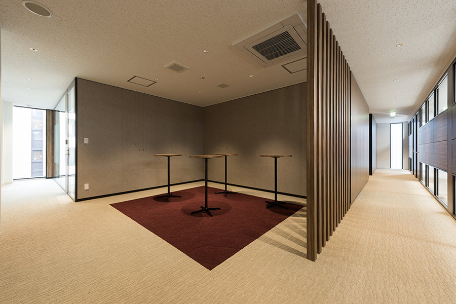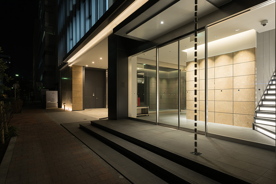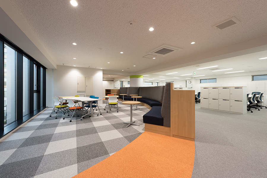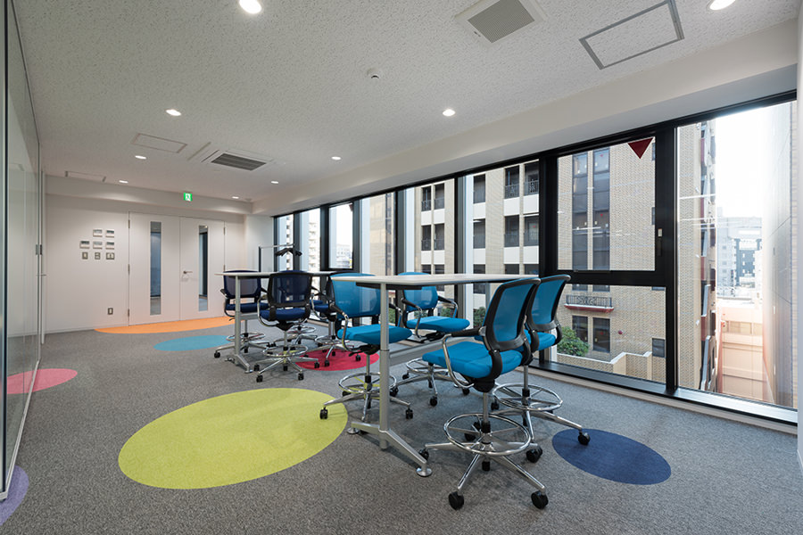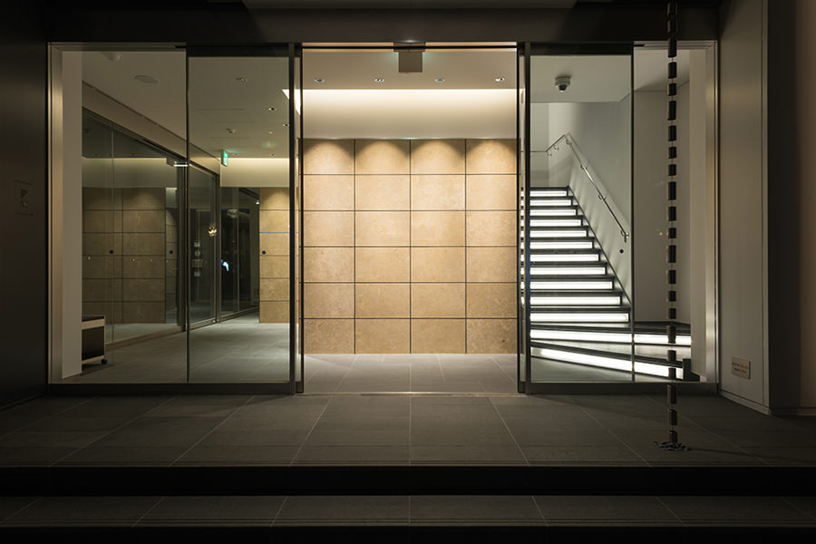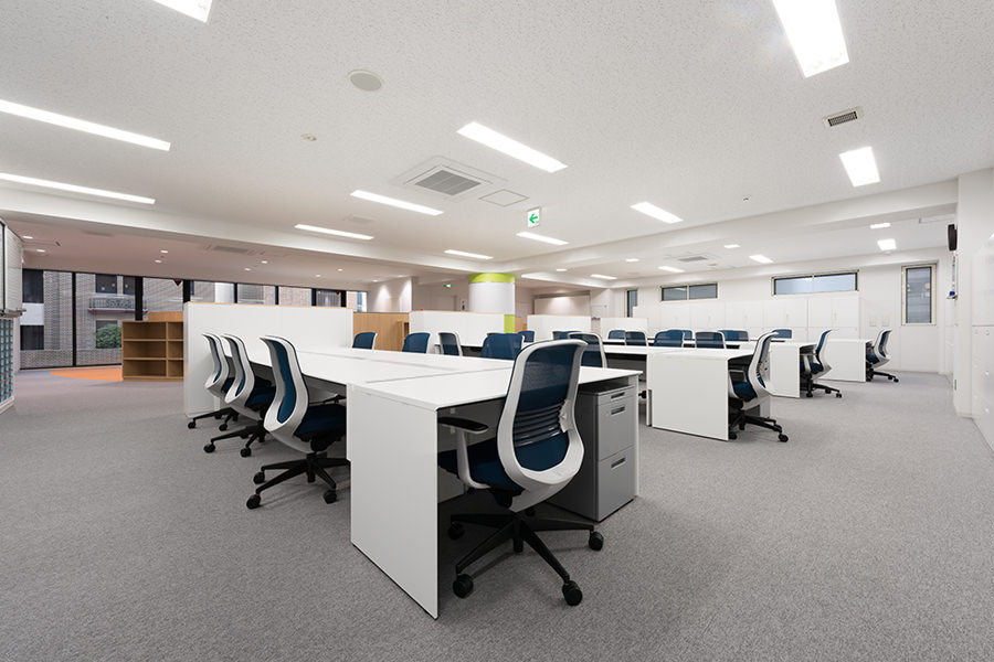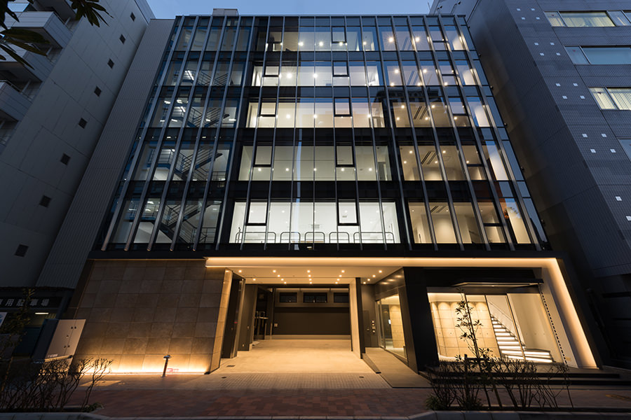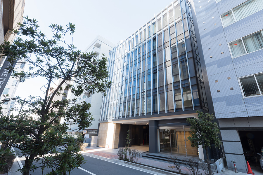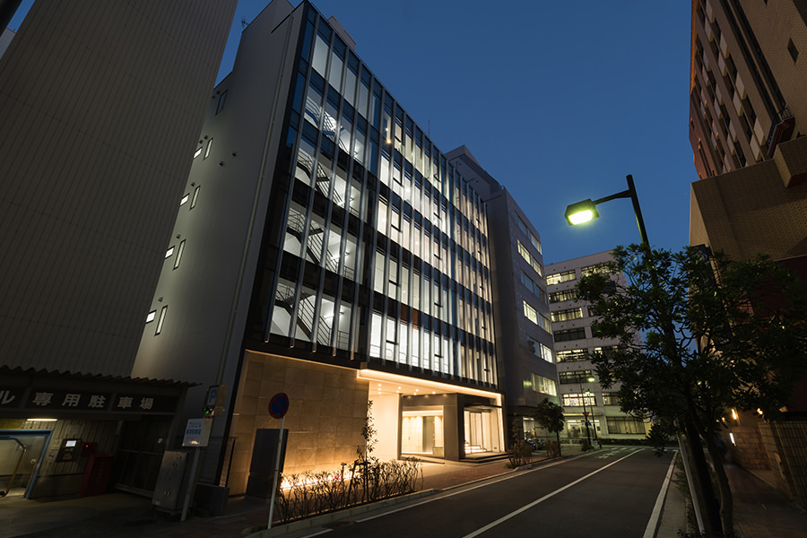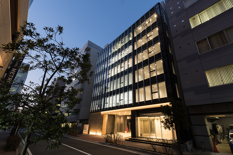 外観のコンセプトは企業カラーのブルーを取り入れ、海外、世界に繋がる企業イメージを體現する為、ガラスカーテンウォールにブルーLow-Eガラスを採用し、カーテンウォールの方立には化粧フィンを設置しました。そうすることで外観に垂直性が生まれ、建物から空へと視線誘導する効果を高め、ガラスのブルーから空のブルーへ視線誘導することで、空へと繋がる、それは世界と繋がる企業であることを表現しています。