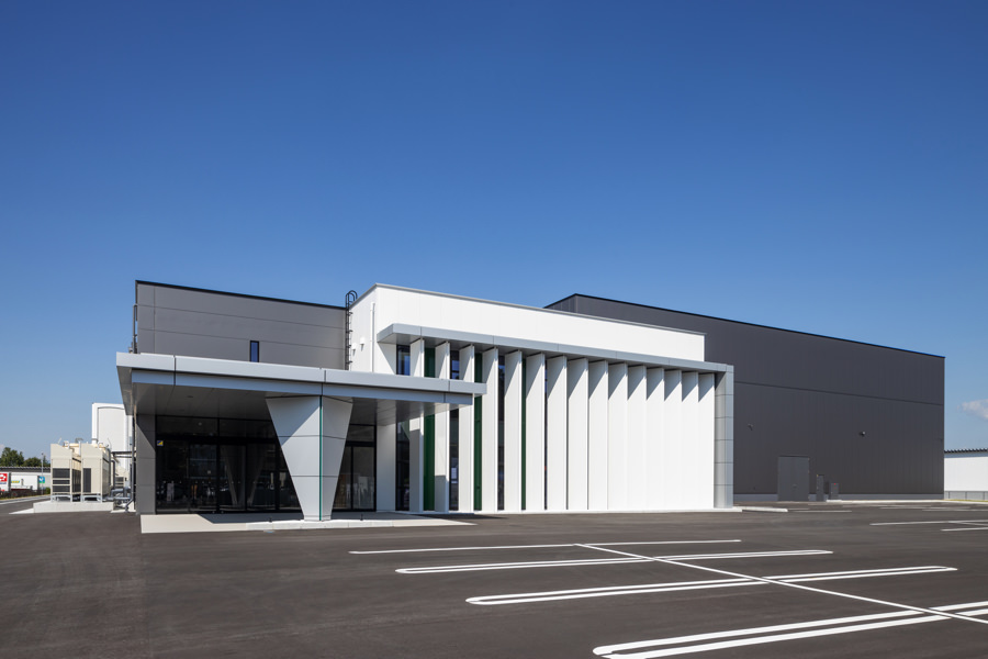 エントランス側(cè)のボリュームはヒューマンスケールに抑え、ボリュームの大きい工場(chǎng)エリアはセットバックして配置させることで來訪者や道路通行者に対し建物の圧迫感を與えないよう配慮しました