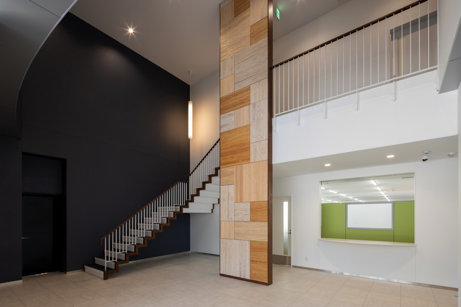 また、ルーバー裏の外壁にコーポレートカラーを施し、見る角度によって変化が生まれる デザインとしました。