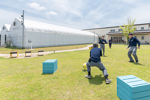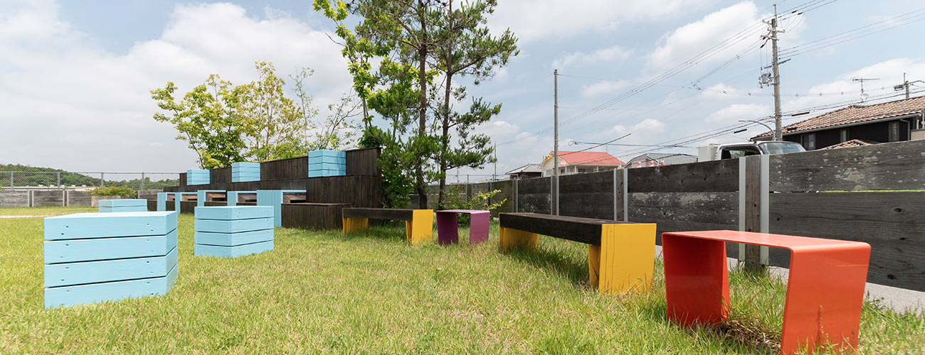 人が集う場づくりのためにアウトドアファーニチャーを設置しています。社員同士が休み時間に交流するのはもちろん、近隣の學校との交流にも活用しています。