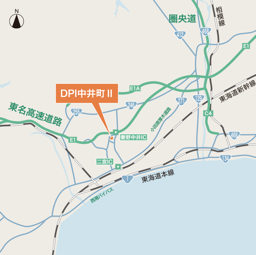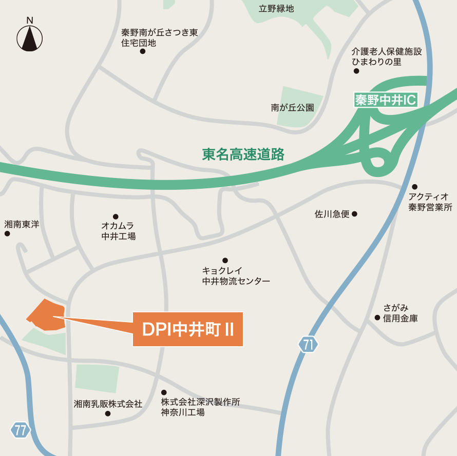 DPI中井町Ⅱは、東名高速道路秦野中井ⅠC附近に造成された工業(yè)団地內(nèi)である「グリーンテクなかい」內(nèi)に位置しており、都心?中部圏へもアクセスできる便利な立地です。工業(yè)専用地域內(nèi)のため、幅広い事業(yè)用建物の建築が可能です。