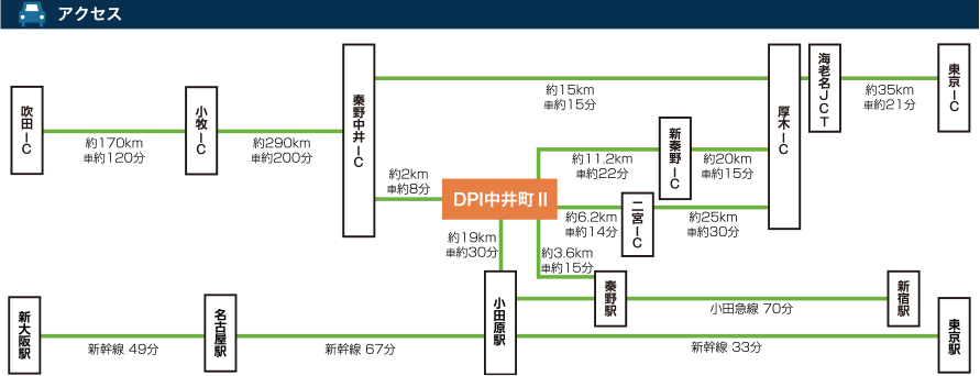 東名高速道路「秦野中井IC」より約2km。首都圏?中部?関西圏へもアクセス可能。