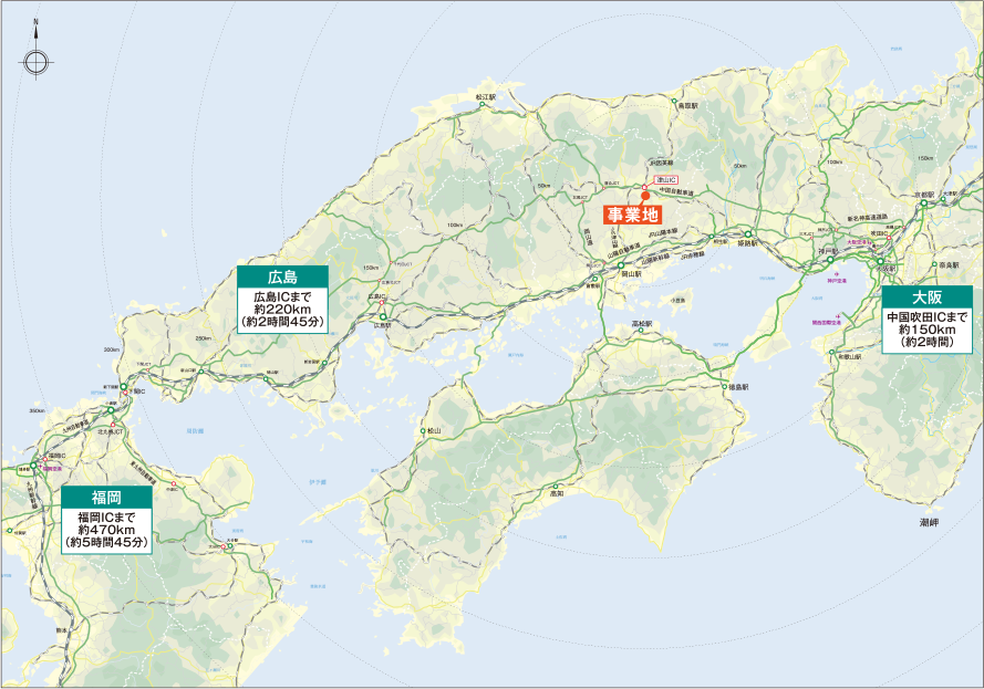 近畿地方と九州地方の中間地點として、企業立地に便利な環境。