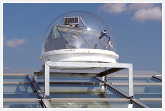 エコボイドは、建物の中央に吹き抜け空間を設け、屋上部分の排気口と自然の風圧による煙突効果で「風の道」をつくり、換気に応用する機能を持っています。また天窓に設置した、太陽電池で起動する太陽光追尾型の採光システム「ソラリス※」で、自然光を1階部分まで採りこむ”光の井戸”としての役割も擔っています。