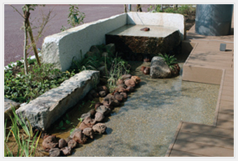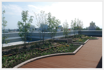 大和ハウス工業 岐阜ビルには、このほかにも岐阜の豊富な井戸水を散水やトイレ排水に利用することや、井戸水の流れる地域の動植物が植え付くことを目指したビオトープ、空間にうるおいと屋內への熱負荷低減のため屋上緑化なども設置しています。