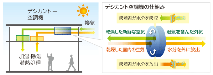 「デシカント空調機」は、冷房時は外部給気の濕気を吸著して外部に排気。暖房時は、逆に室內排気と外部給気の濕気を室內に還流することで濕度を調整し、快適な室內環境とランニングコスト削減を実現できます。