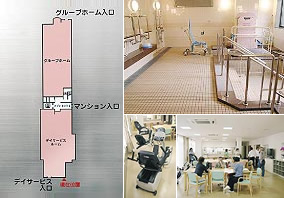 別図を參照していただくとよく分かるように、一階の奧の部分には認知癥の高齢者のためのグループホーム(9人)が続いていますが、もちろん玄関はデイサービスとは別の専用玄関が建物南側に設けられています。