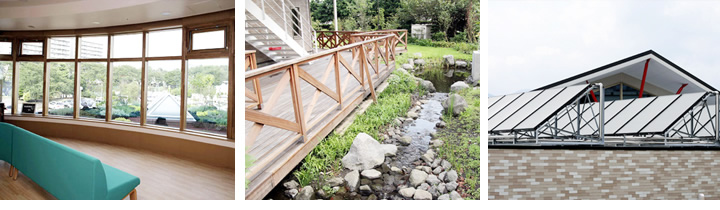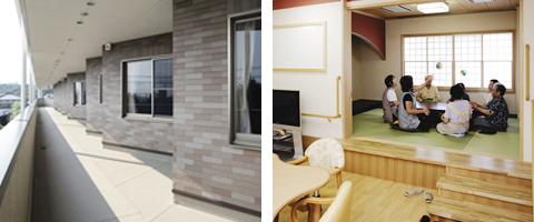 屋外には広々としたガーデンがあり、さまざまなハーブが植えられ、人工池でつくったビオトーブにはメダカが泳ぎ、夏にトンボが飛來するそうです。建物の1階の南面には広い木製のサンデッキがつづき、2階のグループホームの居室はノコギリの歯狀になっていて部屋の獨(dú)立感を高める効果をもたらしています。自宅の延長として設(shè)けられた和の空間、2階の談話室から眺める1階屋上の緑化庭園、本格的な設(shè)備を備えたカラオケルームも自慢の一つです。