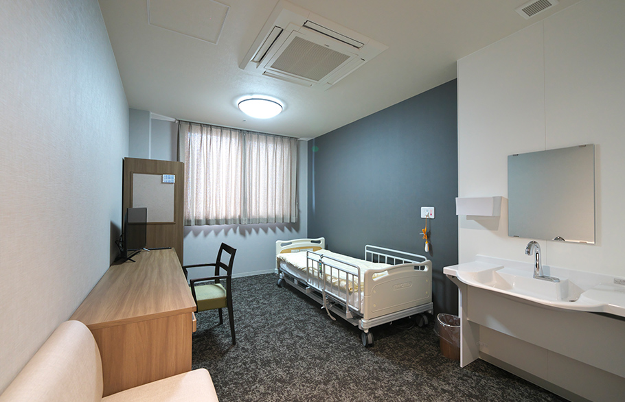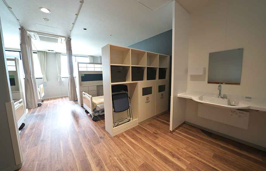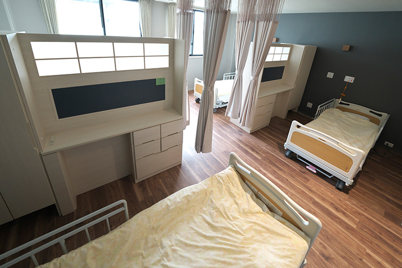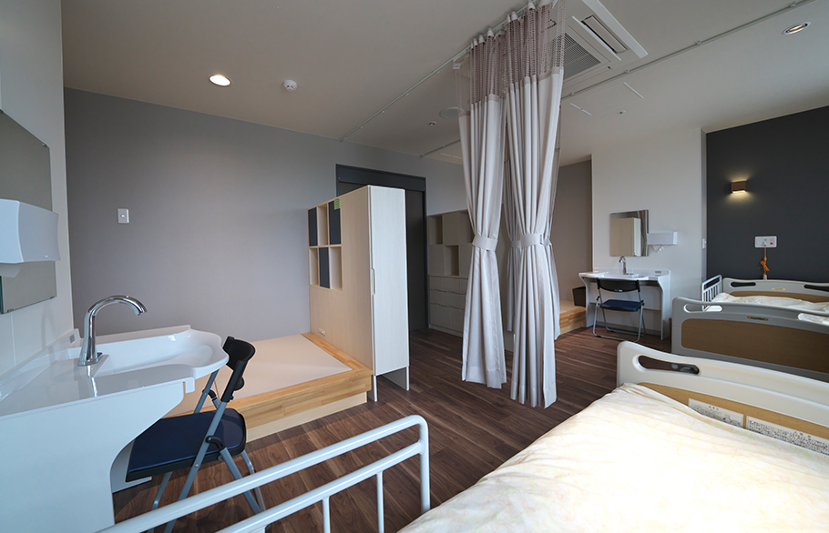 療養(yǎng)室は、4床室×22室、2床室×4室、個室×4室の構(gòu)成。大部分を占める4床室は、移動式の家具を効果的に利用することで、利用者様が落ち著いて過ごせる個室的多床室となっています。