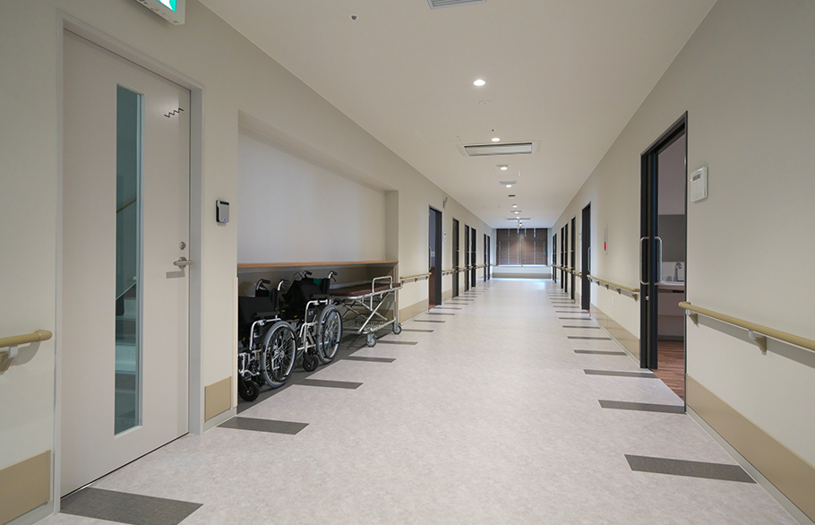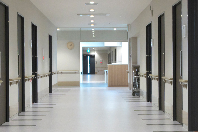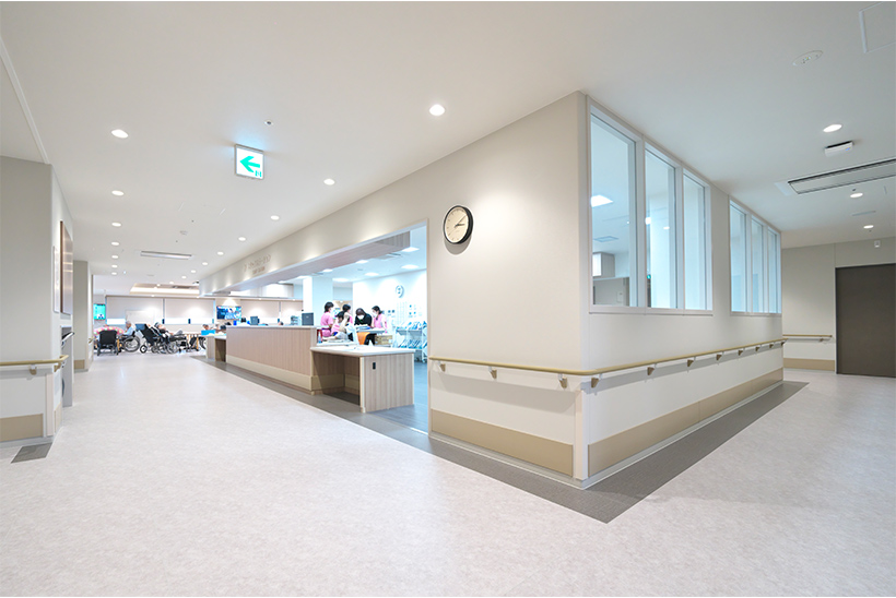 建物の中央に配したスタッフステーションからは、全ての療養(yǎng)室?廊下の様子がうかがえるだけでなく、各室へのスムーズな移動が可能となっています。