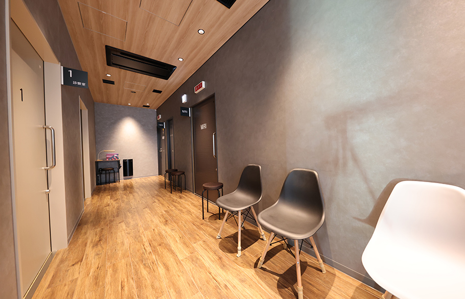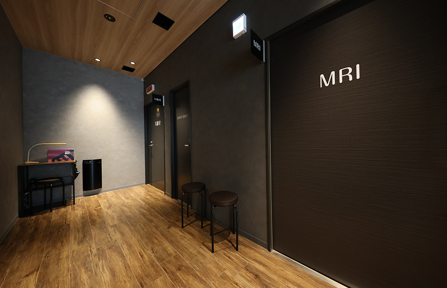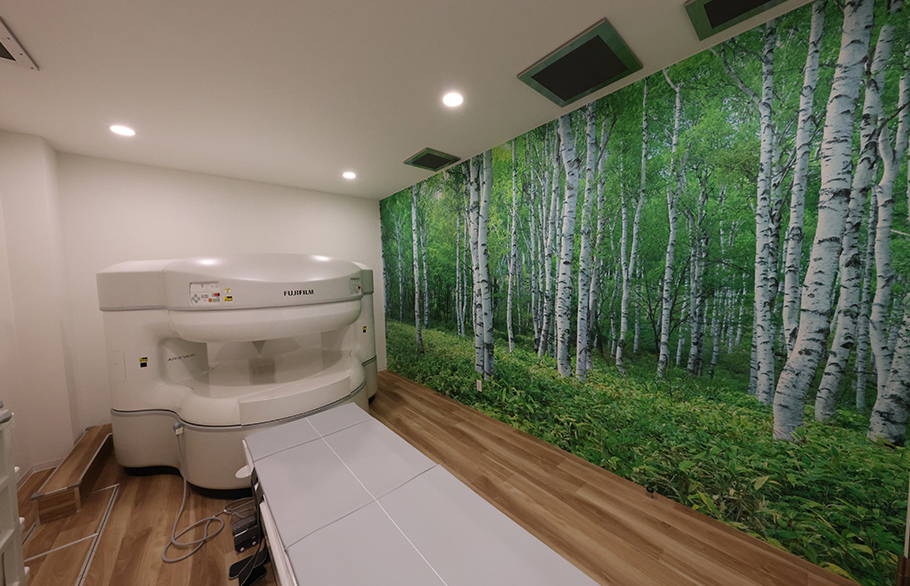 クリニック全體で、患者様にリラックスしていただくために、患者様の五感をいかに刺激するかを意識しながら、內部の設計は行われました。例えば、視覚においては、照明を単に明るさの機能だけでなく、待合室の間接照明は落ち著きを提供し、廊下では、壁や診察室側の番號を綺麗に照らすことで、すれ違う人に対しては顔が見にくくするなど、照明デザインに工夫を凝らしています。また、本院はオープンMRIを採用しており、通常のMRIに比べて靜かで、開放的な空間となっています。壁には、シラカバの綺麗な壁紙が設えられており、患者様に解放感と落ち著きを與えます。