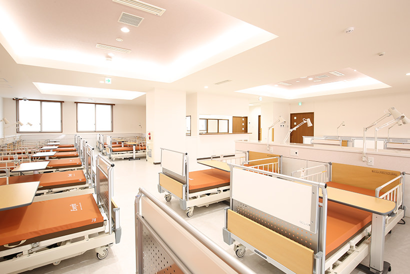 26臺のベッドが並ぶ透析クリニック。長時間滯在する患者様のため、照明の光が直接目に入らないよう配慮されています。