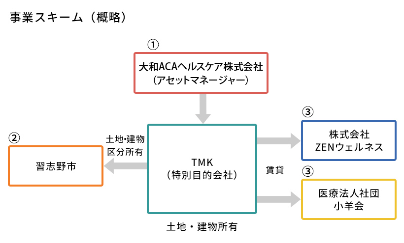 (1)大和ACAヘルスケア様が組成したヘルスケアファンドが運営するTMK(特別目的會社)が建物建築、(2)公共施設部分は土地建物を習志野市様が區分所有、(3)それぞれZENウェルネス様と小羊會様に賃貸するという事業手法です。