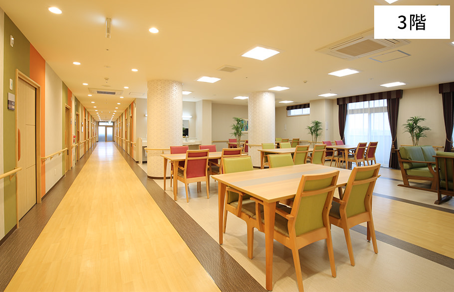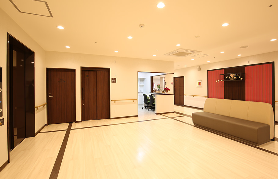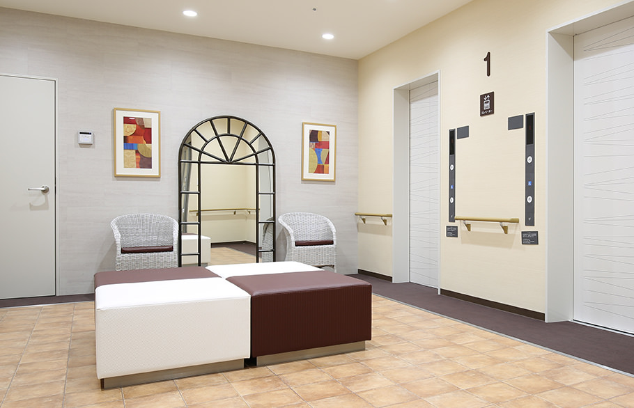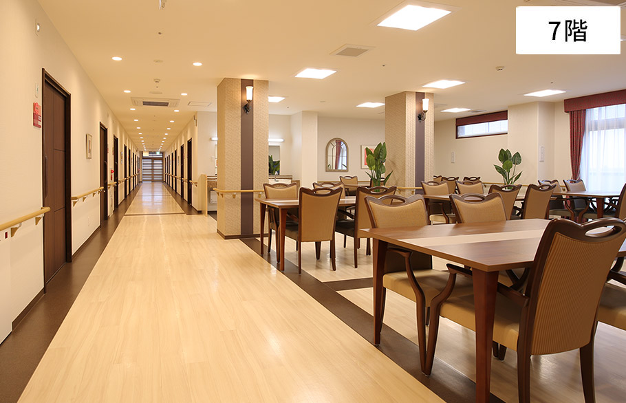 エントランス。食堂?談話室。施設內は、3?4階が和風、5?6階が洋風、1?2?7階がオリエンタル風と、それぞれ異なるインテリアで構成されており、入居者様の多様なこだわりに対応することができます。