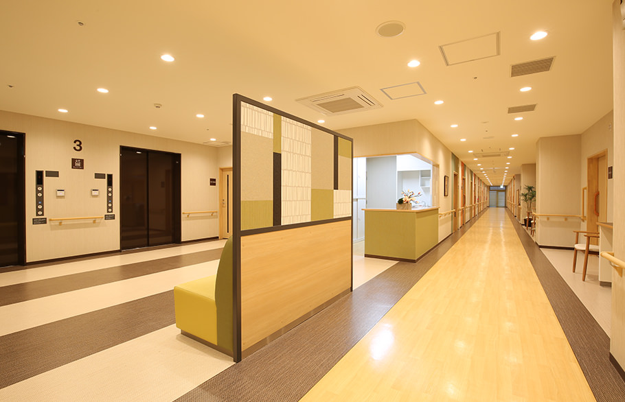 また、入居者様が少し休息できるベンチの裏面である廊下側は掲示板になるなど、多目的な活用が可能です。