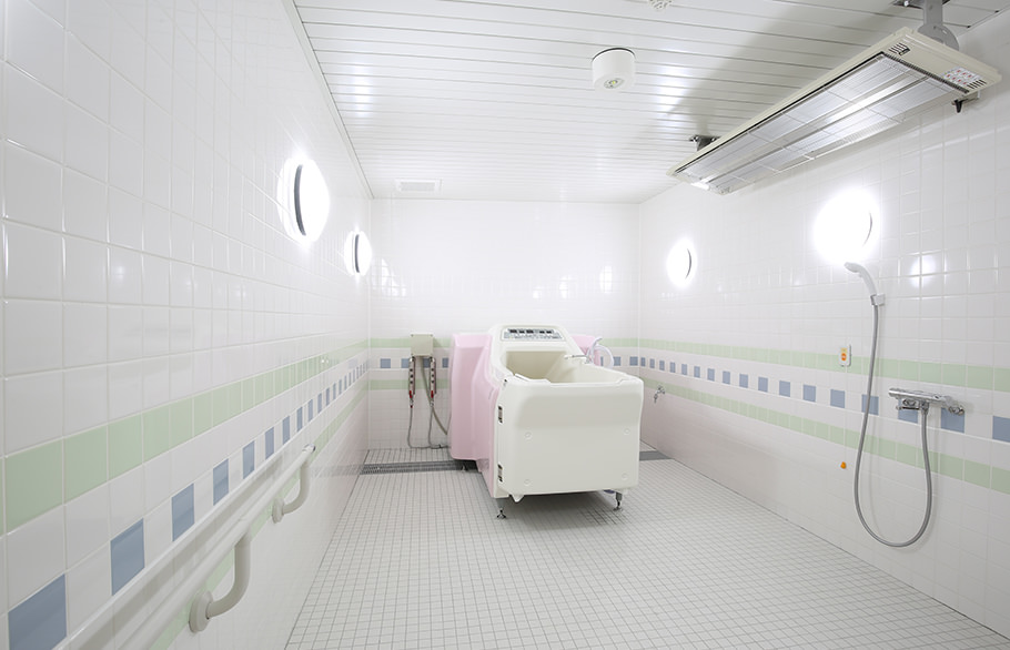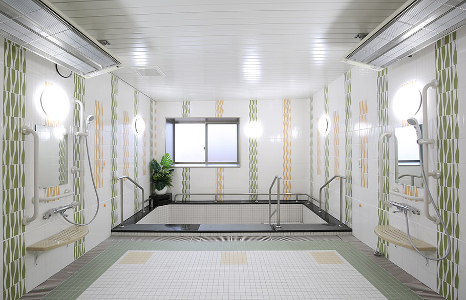 浴室は、大浴槽1、個浴1、特殊浴槽2(寢臺浴、チェア浴)が設けられています。特に大浴槽では、タイルに色の変化を付け、リゾート感を演出しています。