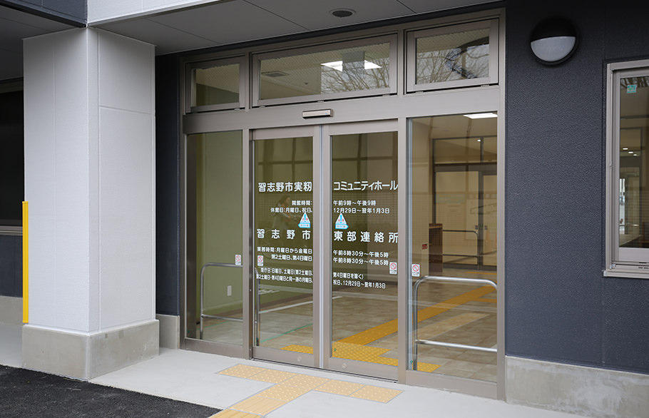 建物の左手には、習志野市実籾コミュニティホール?習志野市東部連絡所の玄関が設けられています。東部連絡所は、住民票?戸籍?印鑑等の証明書を発行する市役所の出先機関としての機能を持っています。