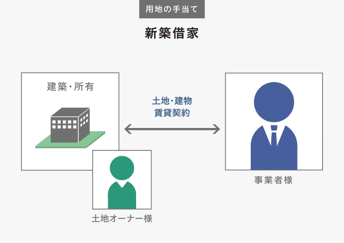 土地オーナー様に建物を建てていただき、土地と建物を一括して借りる事業スタイル。