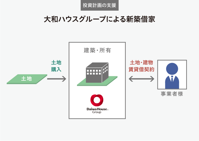 大和ハウス開発型(事業參畫型プロジェクト)では、投資金額が大きい、あるいは設備投資が重なり金融機関による融資が難しい場合などには、大和ハウスグループが土地を購入し、事業者様が希望する建物を建設?賃貸します。