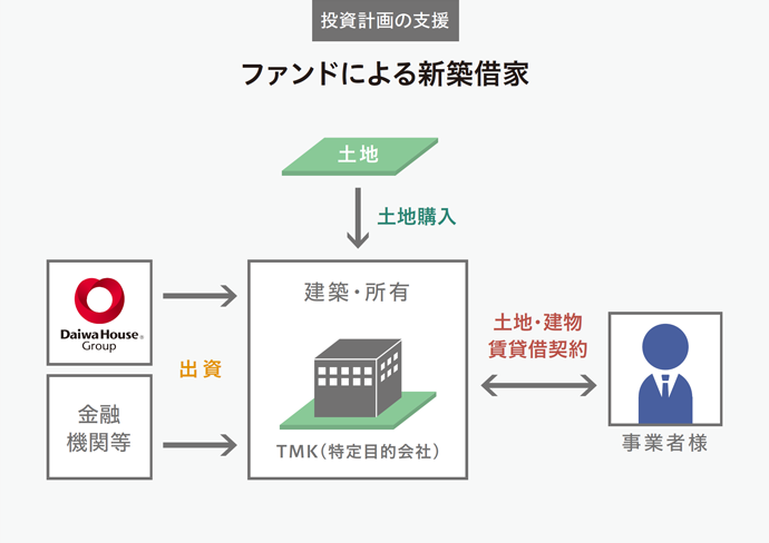 大和ハウスグループや金融機関などが出資した特定目的會社(TMK)を設立。TMKが土地を購入して、建物を建築し、事業者様に賃貸します。