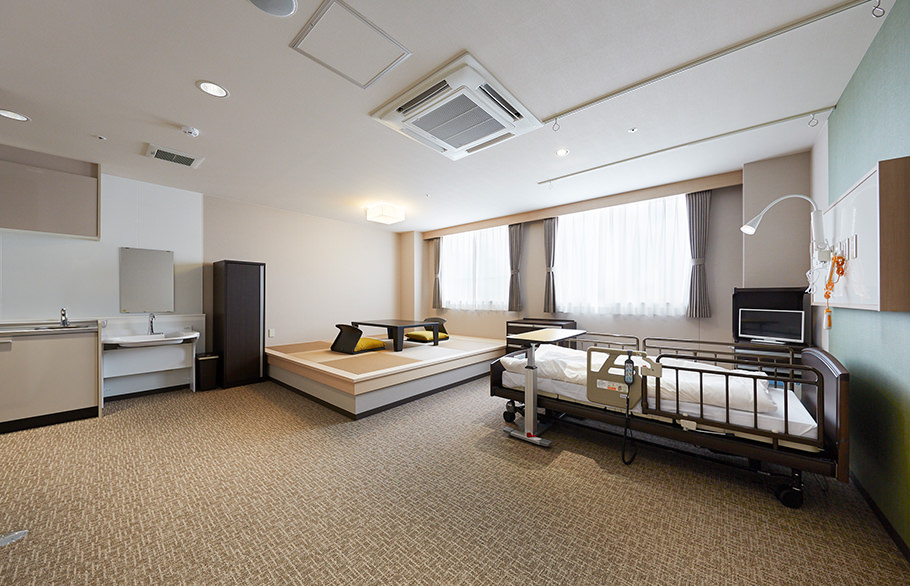 充実の機器を備えた1階のリハビリテーションスペース。ADL(日常生活動作)機能回復のための和室スペースも設けられています。