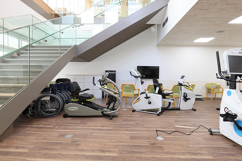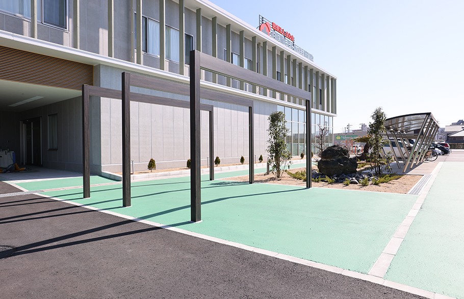 舊病院內に點在していたリハビリテーションスペースを集約。1階の介護リハビリテーション室と2階の醫療リハビリテーション室を専用の階段で直結させました。階段は、患者様のリハビリテーションとしても活用できるなどの工夫を凝らし、機能性と効率性を高めています。また、傘をさしたり段差を設けたりと、日常生活を想定した屋外リハビリガーデンも新設されました。