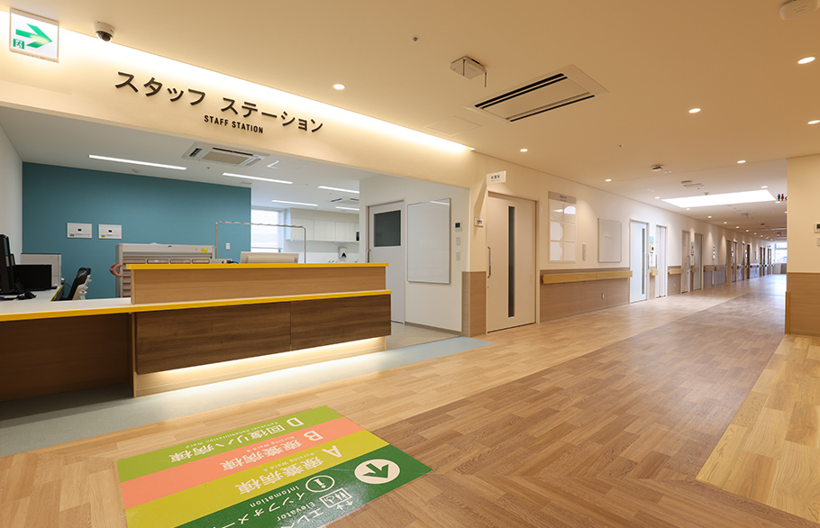 舊病院より2㎞離れた約7,000坪の敷地に建設された新病院。舊病院の縦方向の移動に伴う不具合から、新病院は2階建(一部3階建)の構成とし、橫方向の移動に変更しています。