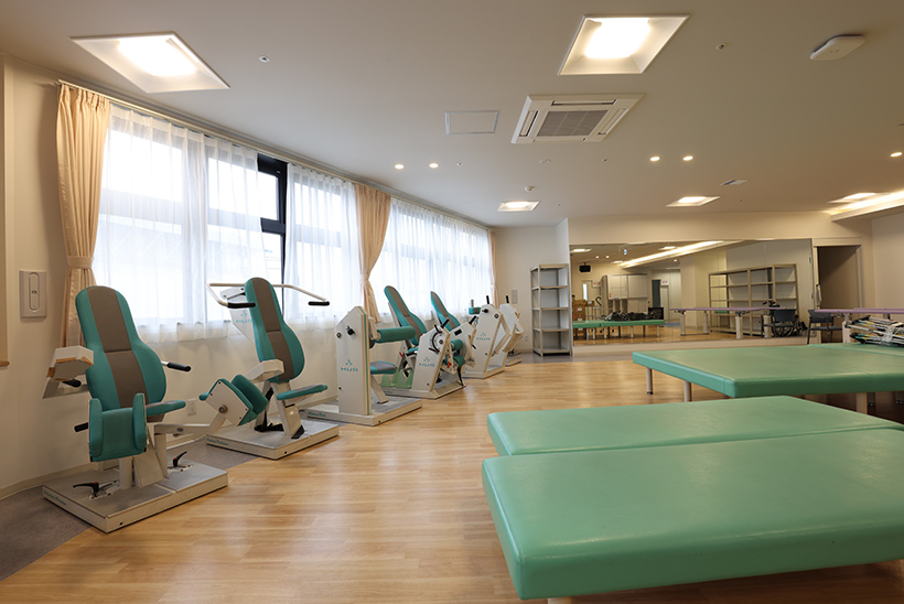 新病院では、3?4階を回復期リハビリテーション病床、5階を一般病床と地域包括ケア病床で構成。「より質の高いリハビリテーションの提供で、心身ともにより良好な狀態で在宅復帰してもらいたい」との思いから、各階に140㎡を超えるリハビリテーションスペースを設けました。