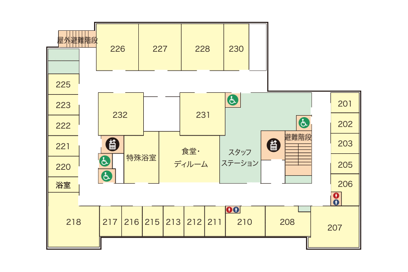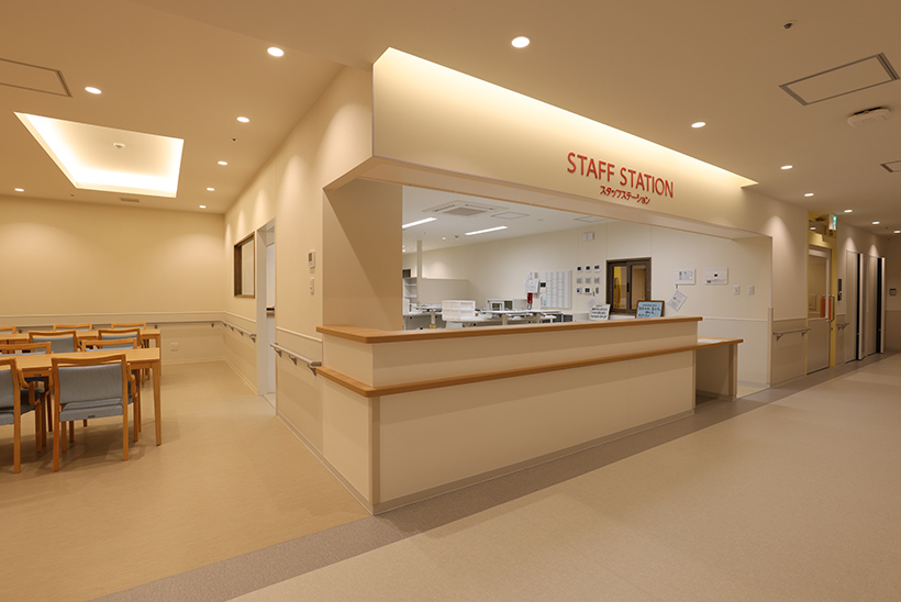 計畫段階から最もこだわったのが、「2階のワンフロアに全50病床を機能的に配置する」こと。幾度となく改良を重ね、最終的に実現したのが、スタッフステーションと食堂?デイルームを中央に置き、周囲に病室を配置する回廊式のレイアウトです。